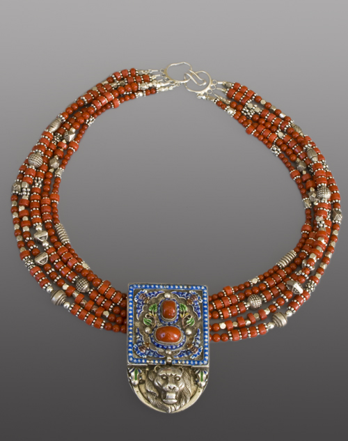 It is combined with 5 strands of coral and antique Indian silver beads.